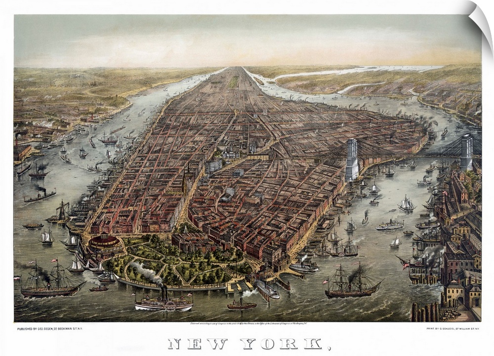 <p>Aerial view of New York City, looking north from Lower Manhattan. Lithograph by George Schlegel, c1873.</p>