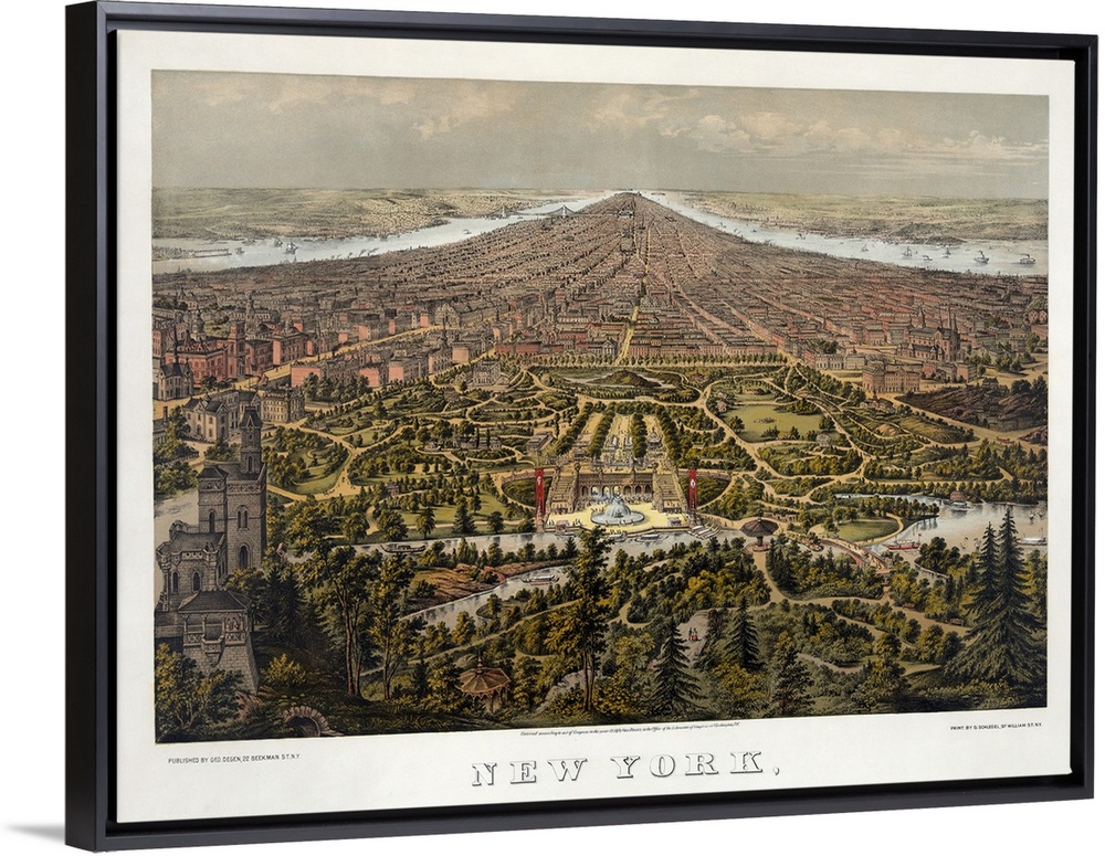 <p>Aerial view of New York City, looking south over Central Park. Lithograph by George Schlegel, c1873.</p>