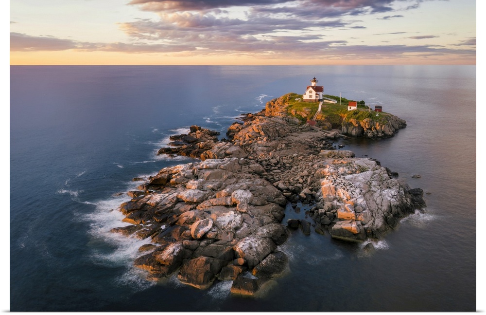<p>Aerial view of Nubble Lighthouse at sunrise, Cape Neddick, Maine, USA.</p>