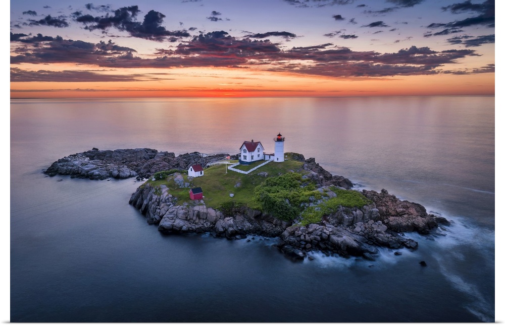 <p>Aerial view of Nubble Lighthouse at sunrise, Cape Neddick, Maine, USA.</p>