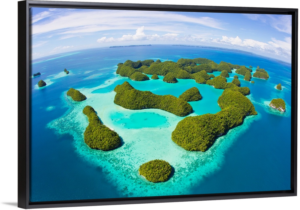 <p>An aerial fisheye lens view of Palau's Rock Islands in the turquoise waters of the Pacific Ocean.</p>