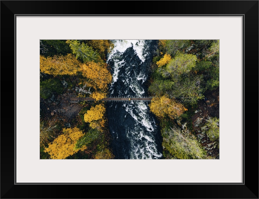 <p>Aerial View Of River With Suspension Bridge In Colorful Autumn Forest In Lapland, Finland</p>