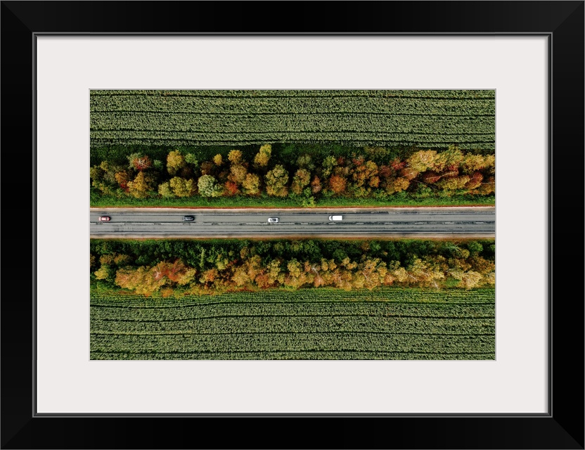 <p>Aerial View Of Road And A Car In Autumn Forest With Red, Yellow And Orange Leaves</p>