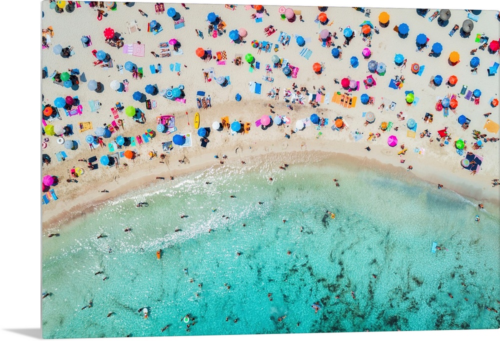 <p>Aerial view of sandy beach with colorful umbrellas, swimming people in sea bay with transparent blue water in sunny morning in summer. Travel in Mallorca, Balearic islands, Spain. Top view. Landscape.</p>