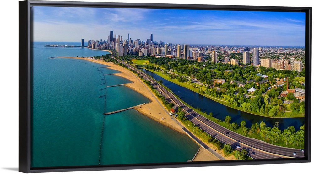<p>Aerial view of shoreline and Lincoln Park lagoon, Chicago, Cook County, Illinois, USA</p>