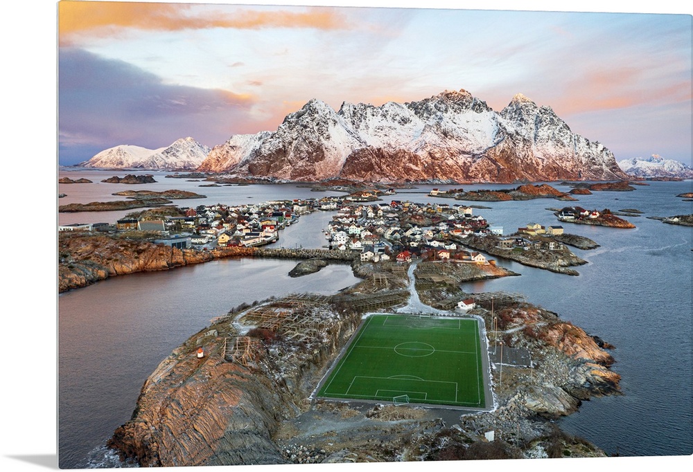 <p>Aerial view of soccer stadium and Henningsvaer village during winter dawn, Nordland county, Lofoten Islands, Norway, Scandinavia, Europe</p>