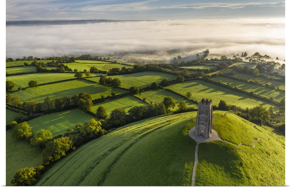<p>Aerial view of St. Michael's Tower on Glastonbury Tor on a misty autumn morning, Somerset, England. Autumn (September) 2020.</p>