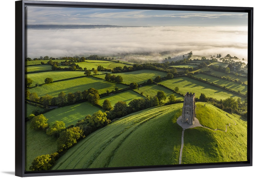 <p>Aerial view of St. Michael's Tower on Glastonbury Tor on a misty autumn morning, Somerset, England. Autumn (September) 2020.</p>