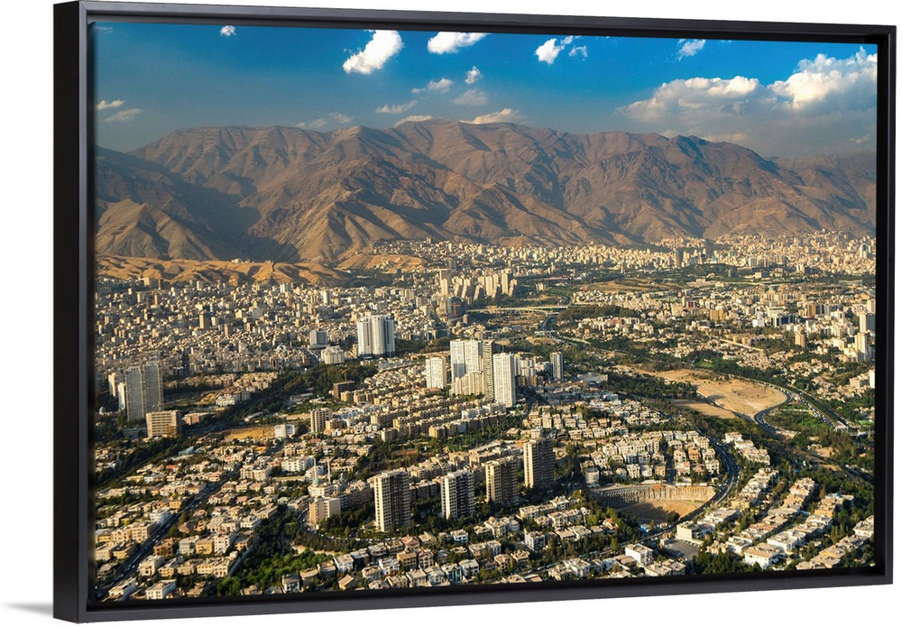 <p>Aerial view of Tehran facing North towards the Alborz Mountains, Tehran, Iran, Middle East</p>