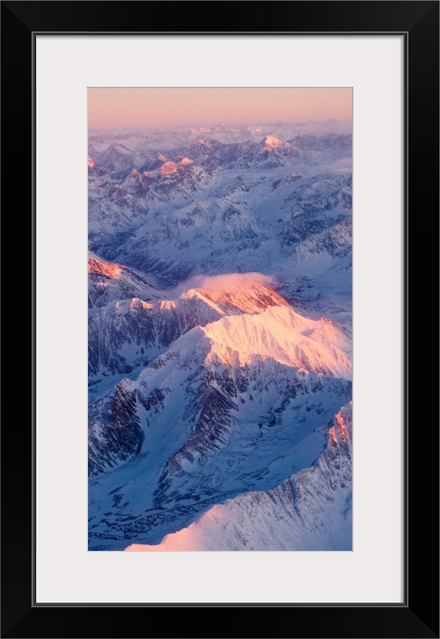 <p>Aerial view of the Chugach Mountain range with sunrise alpenglow hitting the peaks during Winter in Southcentral Alaska</p>