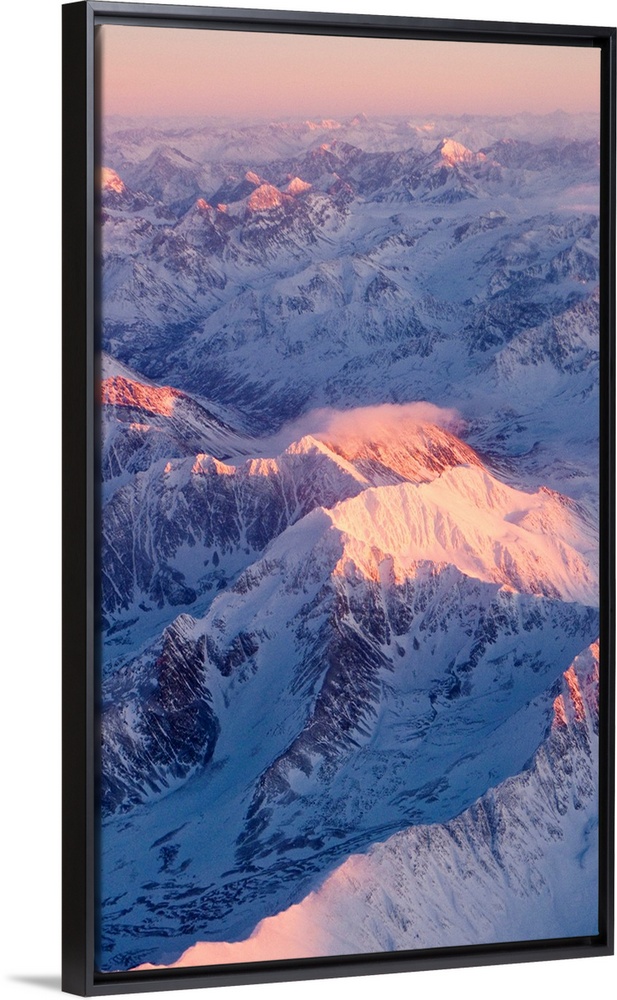 <p>Aerial view of the Chugach Mountain range with sunrise alpenglow hitting the peaks during Winter in Southcentral Alaska</p>