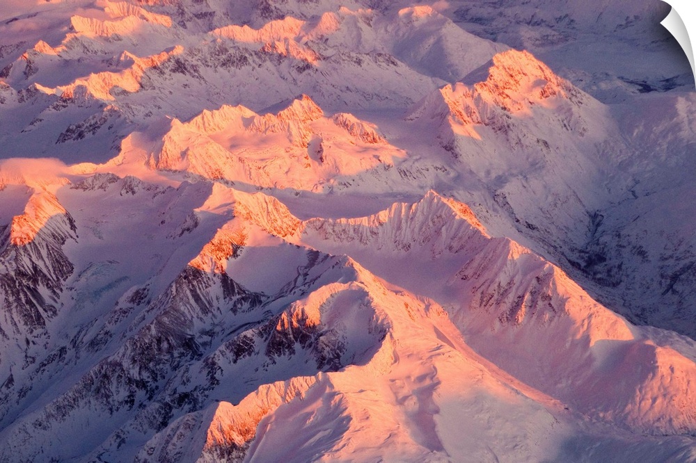 <p>Aerial view of the Chugach Mountain range with sunrise alpenglow hitting the peaks during Winter in Southcentral Alaska</p>