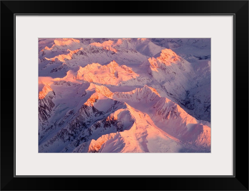 <p>Aerial view of the Chugach Mountain range with sunrise alpenglow hitting the peaks during Winter in Southcentral Alaska</p>