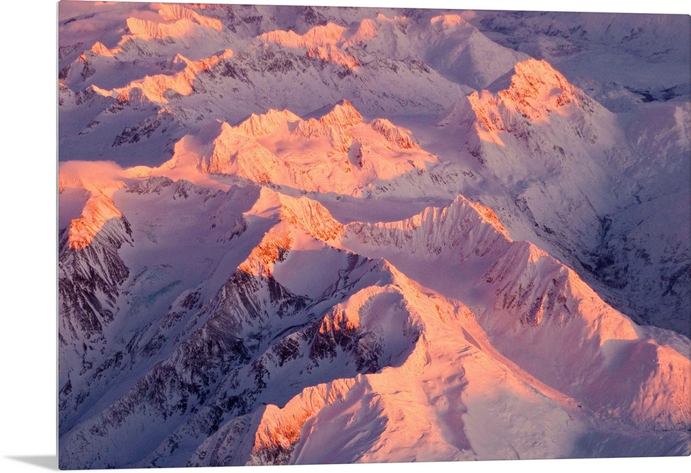 <p>Aerial view of the Chugach Mountain range with sunrise alpenglow hitting the peaks during Winter in Southcentral Alaska</p>