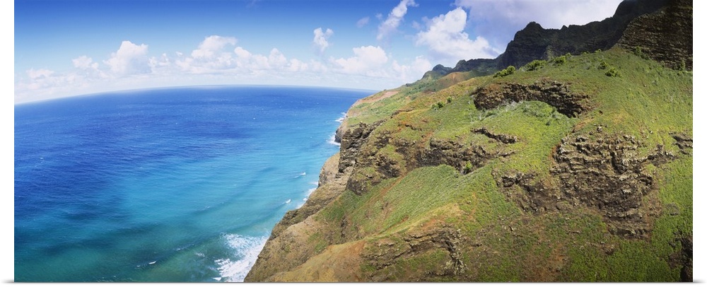 <p>Panoramic photograph of rocky grass covered cliff near water's edge under a cloudy sky.</p>