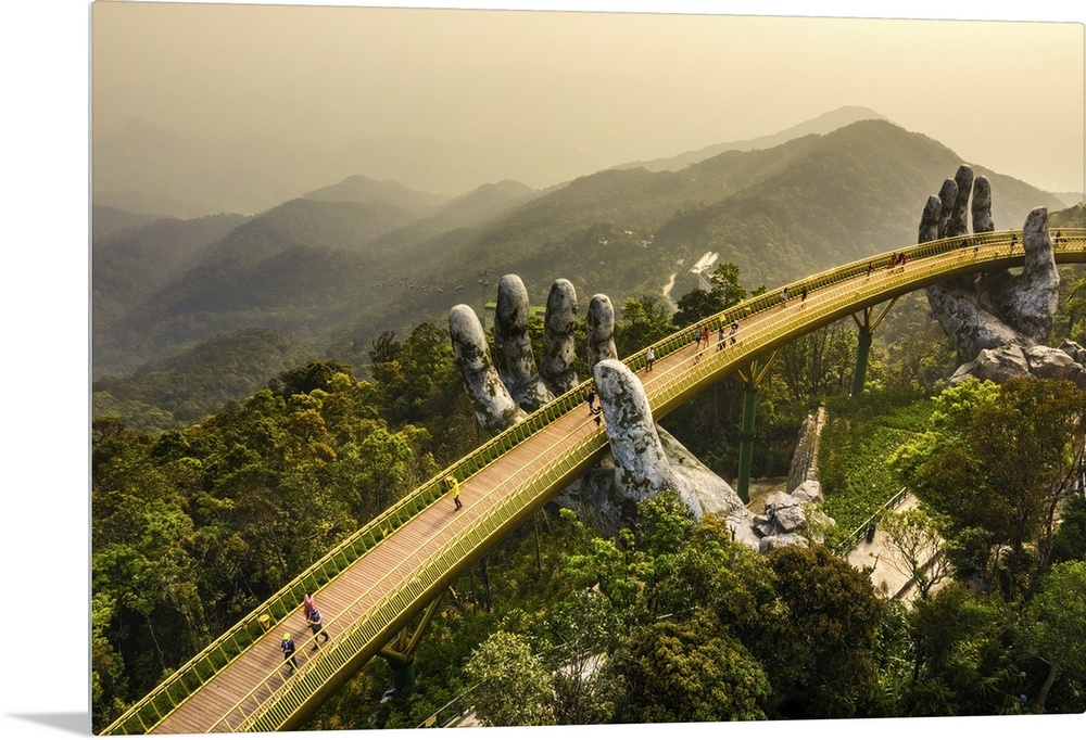 <p>Aerial View Of The Golden Bridge Lifted By Two Giant Hands, Ba Na Hill, Da Nang, Vietnam</p>