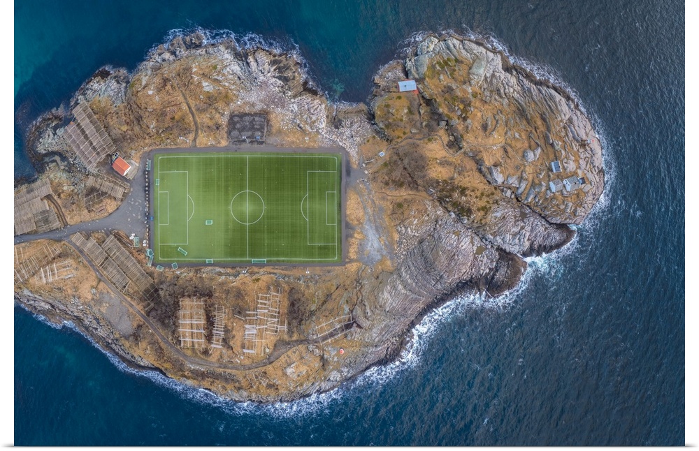 <p>Aerial view of the Henningsvaer stadium on the island of Hellandsoya, Lofoten Islands, Nordland, Norway.</p>