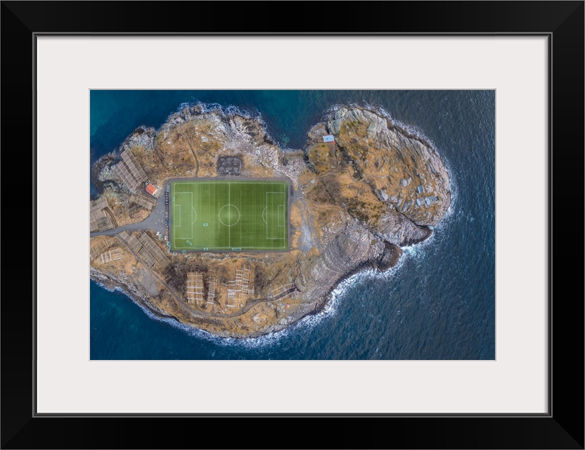 <p>Aerial view of the Henningsvaer stadium on the island of Hellandsoya, Lofoten Islands, Nordland, Norway.</p>