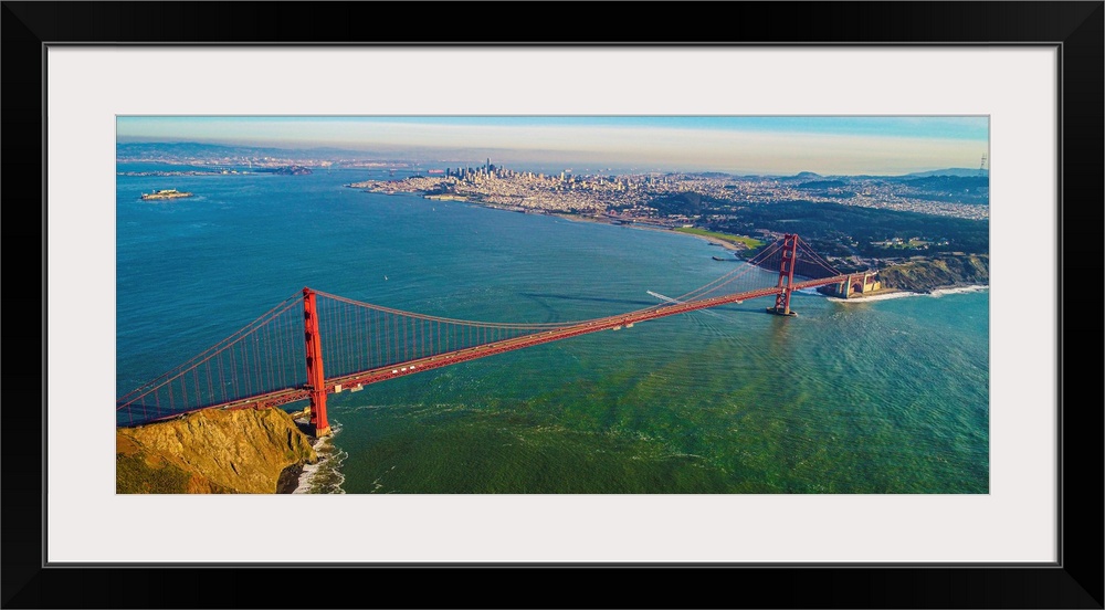 <p>Aerial view of the iconic golden gate bridge near San Francisco. Location: San Francisco, California.</p>