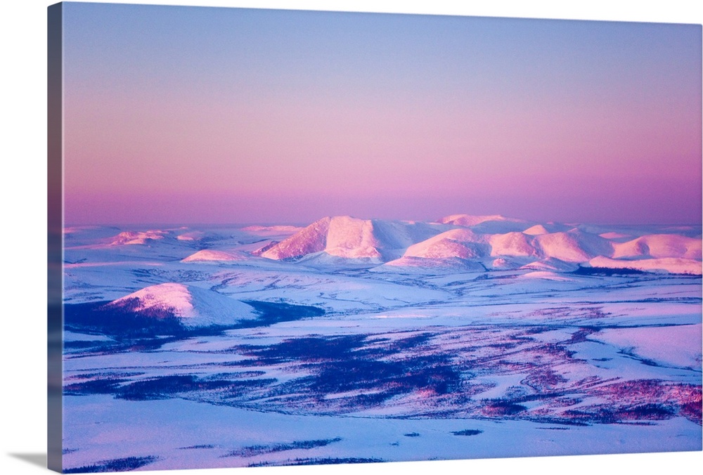 <p>Aerial view of the Noatak River valley and the Baird Mountains just before sunset during Winter, Arctic Alaska</p>
