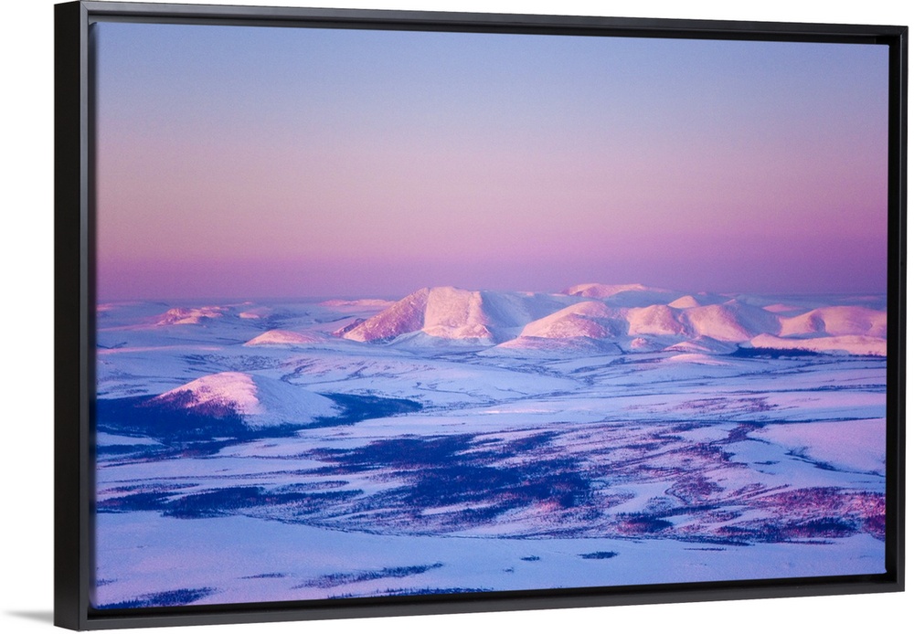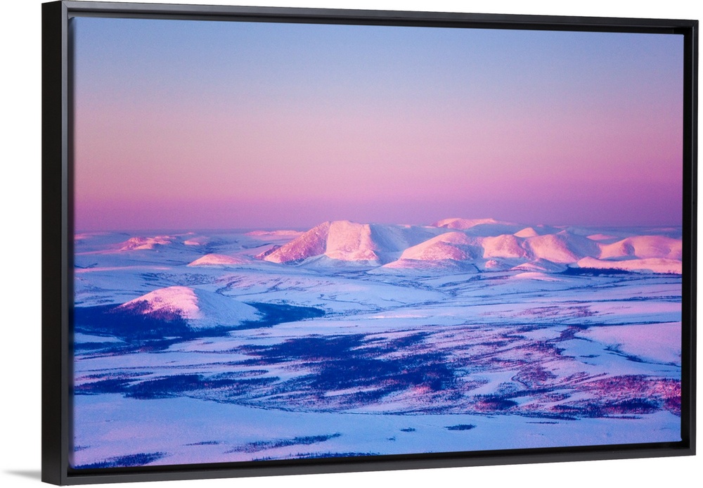 <p>Aerial view of the Noatak River valley and the Baird Mountains just before sunset during Winter, Arctic Alaska</p>