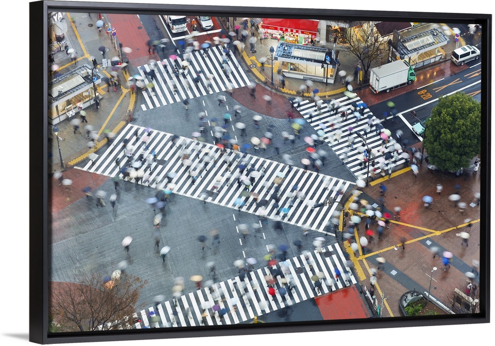 <p>Aerial view of crowds crossing the famous Shibuya Crossing crosswalks at the centre of Shibuya's fashionable shopping and entertainment district, Shibuya, Tokyo, Japan, Asia</p>