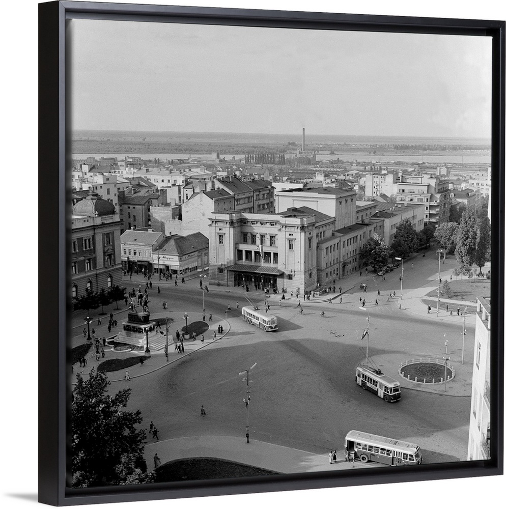 <p>The Square of the Republic is the largest square in the modern section of Belgrade, capital of Yugoslavia. Trolley buses are almost the only mean of transportation in the city, which therefore has no traffic problems. Facing the square is Yugoslavia's national theater, and on left is a bronze statue dedicated to Prince Michailov, Serbian national hero of the Turkish Wars. Beyond the low rooftops is the Danube.</p>