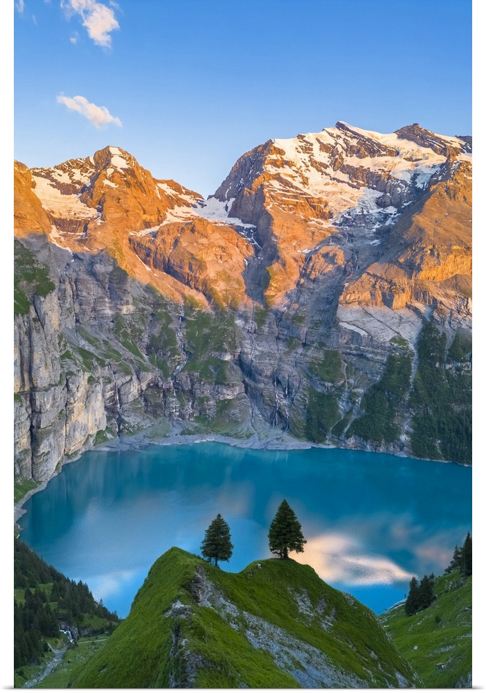 <p>Aerial view of the sunset on the mountains surrounding Oeschinensee. Kandersteg, Bernese Oberland, Frutigen-Niedersimmental administrative district, Canton of Bern, Switzerland.</p>
