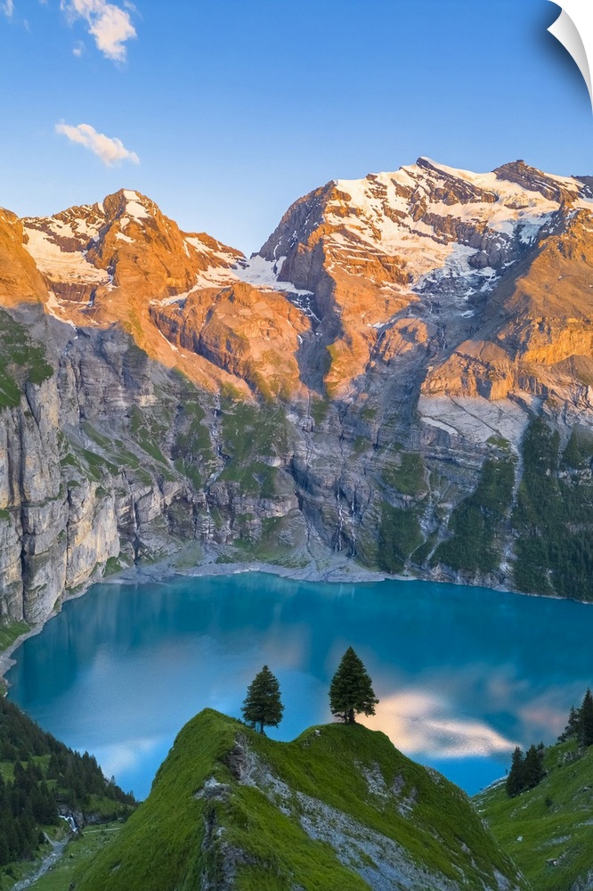 <p>Aerial view of the sunset on the mountains surrounding Oeschinensee. Kandersteg, Bernese Oberland, Frutigen-Niedersimmental administrative district, Canton of Bern, Switzerland.</p>