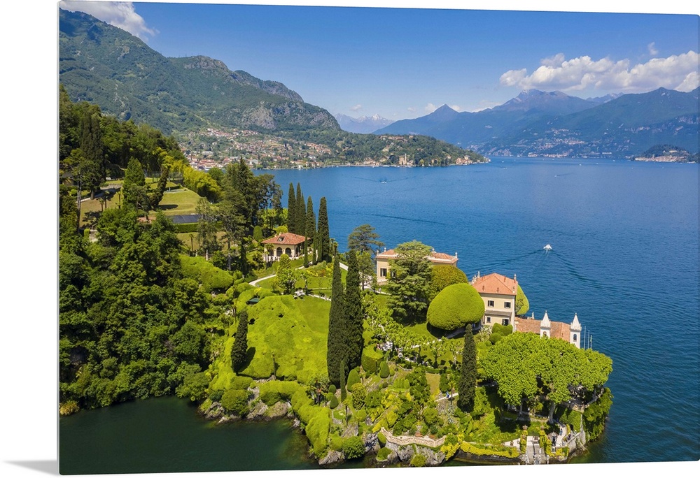 <p>Aerial view of the Villa del Balbianello, on the Lavedo peninsula. Lenno, Tremezzina, Como Lake, Lombardy, Italy.</p>