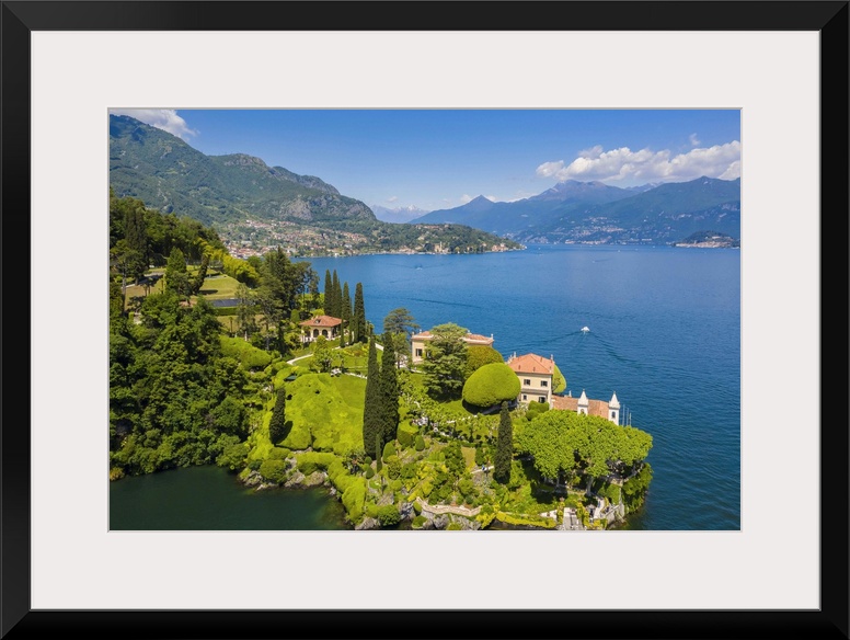 <p>Aerial view of the Villa del Balbianello, on the Lavedo peninsula. Lenno, Tremezzina, Como Lake, Lombardy, Italy.</p>