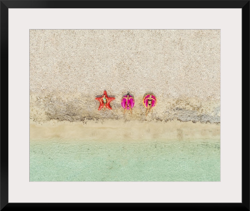 <p>Aerial View Of Three Women Lying On Inflatable Star, Donut, And Flamingo Floats On Beach</p>