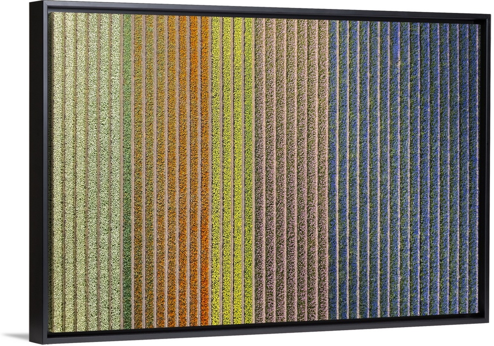 <p>Aerial view of tulips stripes of various colors in spring. De Zilk, Noordwijk, Zuid-Holland district, Nederland.</p>