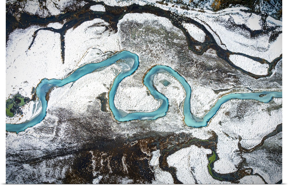 <p>Aerial view of turquoise water of a river in a snowy landscape, Predarossa, Valmasino, Lombardy, Italy</p>