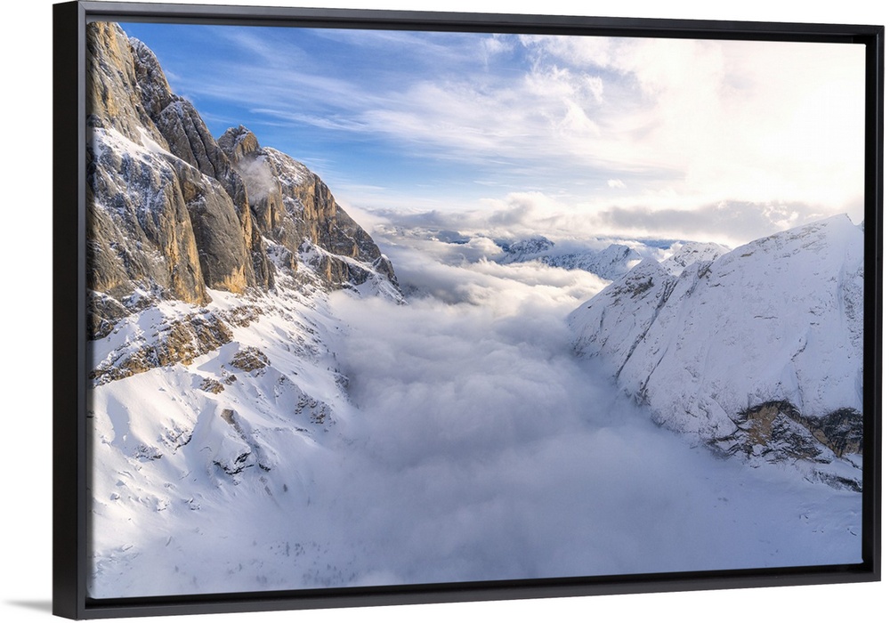 <p>Aerial view of Valle Ombretta covered by clouds from Marmolada, Dolomites, Veneto, Italy, Europe</p>