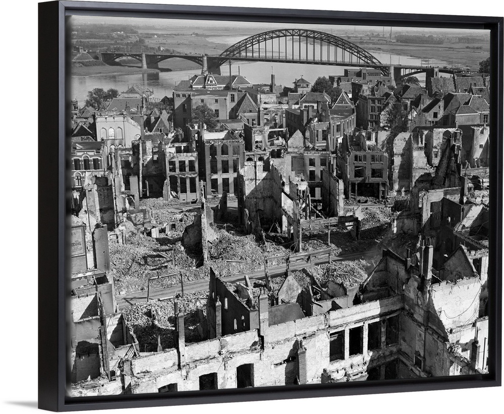 <p>A panoramic view of the city of Nijmegen, Holland, and the Nijmegen Bridge over the Waal (Rhine) River in the background. The city was hit by Germans and Allied bombardment and shelling.</p>