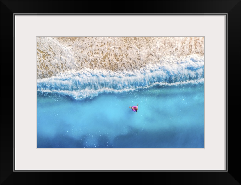 <p>Aerial View Of Woman With Donut Float In The Transparent Blue Sea At Sunset In Summer</p>