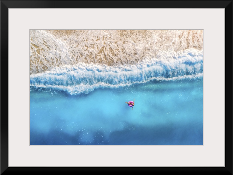 <p>Aerial View Of Woman With Donut Float In The Transparent Blue Sea At Sunset In Summer</p>