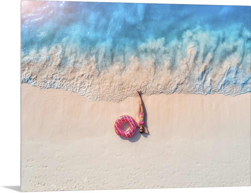 <p>Aerial view of the beautiful young lying woman with pink donut swim ring on the white sandy beach near sea with waves at sunset. Summer holiday. Top view of slim girl, clear azure water. Indian ocean.</p>