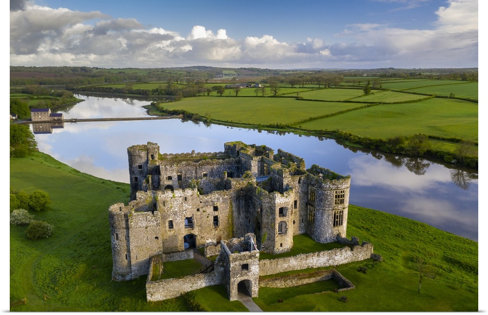 <p>Aerial vista of Carew Castle in Pembrokeshire Coast National Park, Wales, UK. Spring (May) 2021.</p>