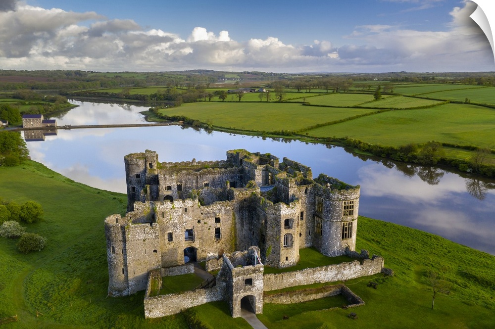 <p>Aerial vista of Carew Castle in Pembrokeshire Coast National Park, Wales, UK. Spring (May) 2021.</p>