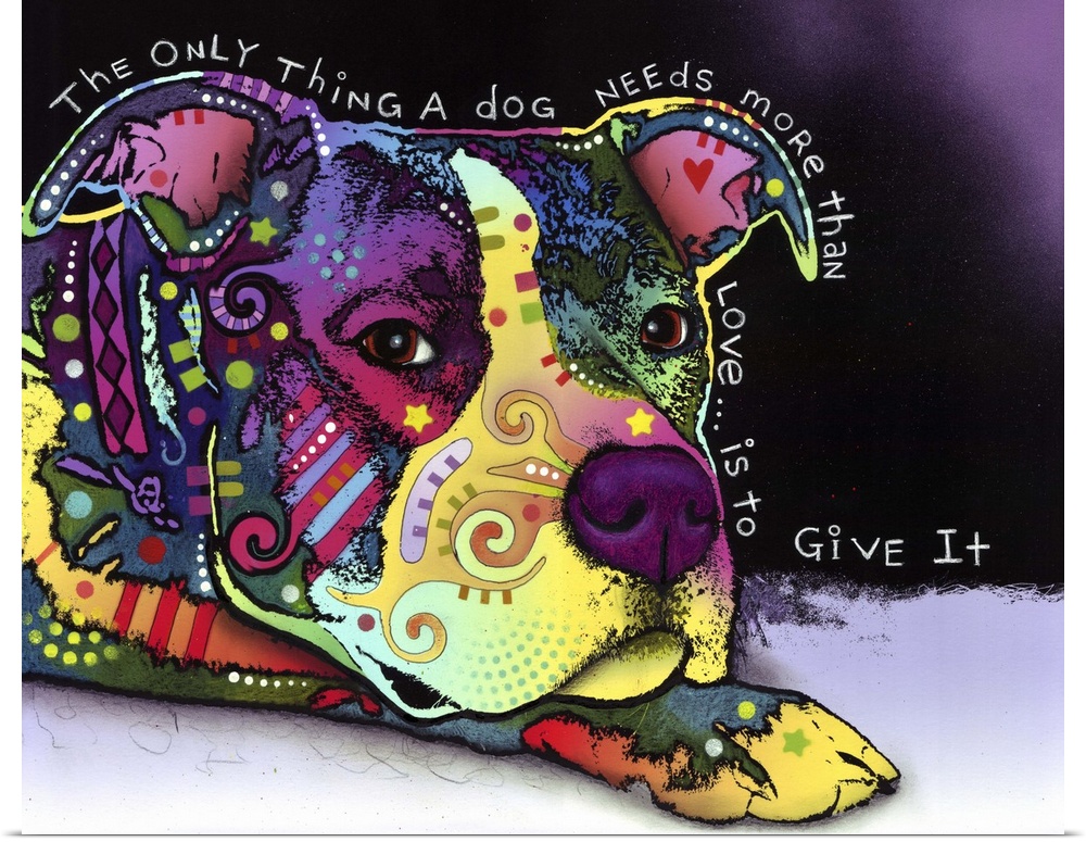 <p>Contemporary artwork of dog silhouette filled with colorful patterns and textures with the test "The only thing a dog needs more than love, is to give it," surrounding it.</p>