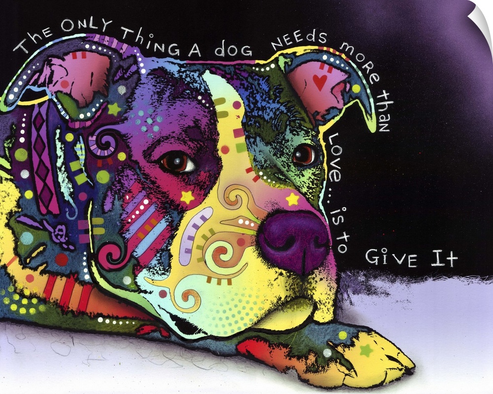 <p>Contemporary artwork of dog silhouette filled with colorful patterns and textures with the test "The only thing a dog needs more than love, is to give it," surrounding it.</p>