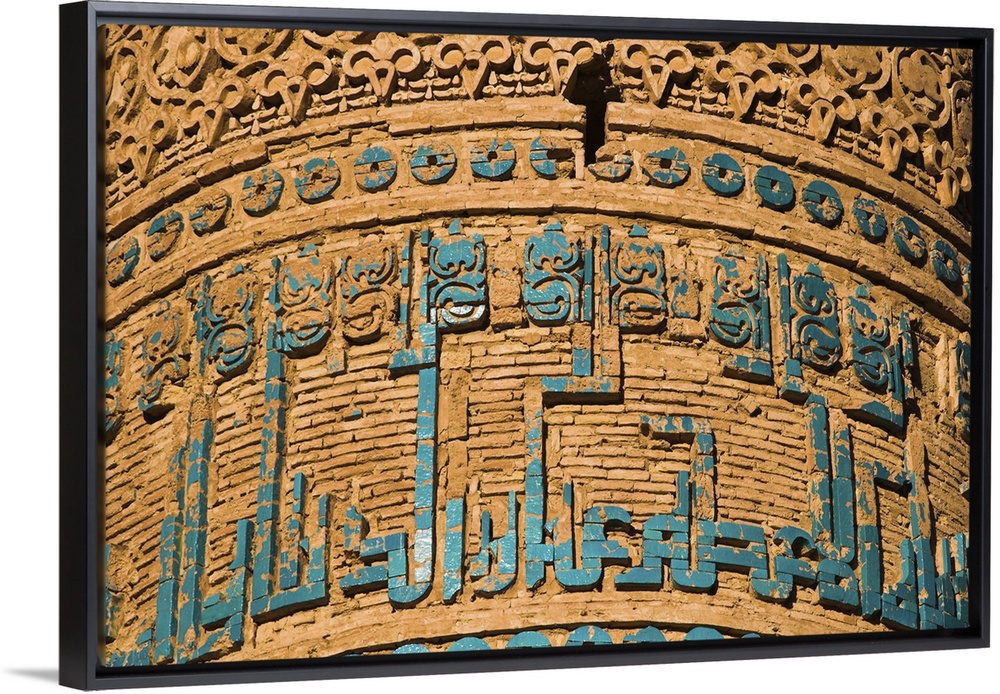<p>AFGHANISTAN, Ghor Province, 12th Century Minaret of Jam, Detail of decoration on minaret including Kufic inscription in turquoise glazed tiles..Discovered by archaeologists in 1957 but was its first sighting was announced by the Governer of Herat in 1943. An inscription round the Minaret confirms it was built by the Ghurid ruler Sultan Ghiyath ad-Din in the year 590 Hejira, (1193-3 CE - Pinder-Wilson 2001) Has Kufic script and verses of the Koran on the exterior and inside is a double-spiral staircase. At 65 metres high it is the second highest minaret in the world (after Qutb Minar in Delhi) Situated at the confluence of the Hari Rud and Jam Rud rivers in an isolated valley renown for Bandits, became a World Heritage site in 2002, Scholars generally agree that Jam is ancient Firuzkuh, the summer capital of thee Ghurid empire</p>