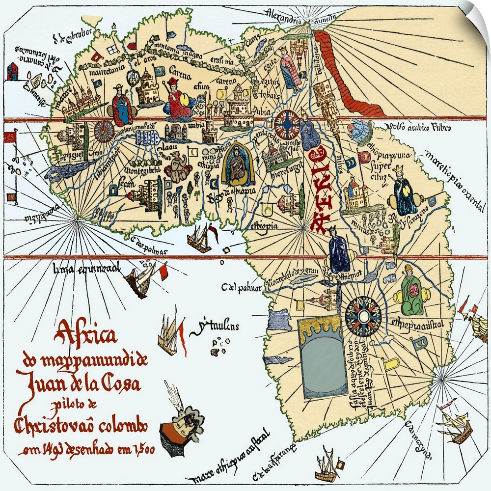 <p>Africa, from Juan de la Cosa's map of 1500. Juan de la Cosa (1460-1510) was a Spanish navigator and cartographer. In 1493 he joined Columbus on his second expedition to the New World. This map is a section of the world map produced by Cosa in 1500. The depiction of Africa owes much to the Portuguese explorer Vasco de Gama who, in 1497, found a trade route to India around the southernmost tip of Africa. Taken from A Book of Discovery (1912) by M.B. Synge.</p>
