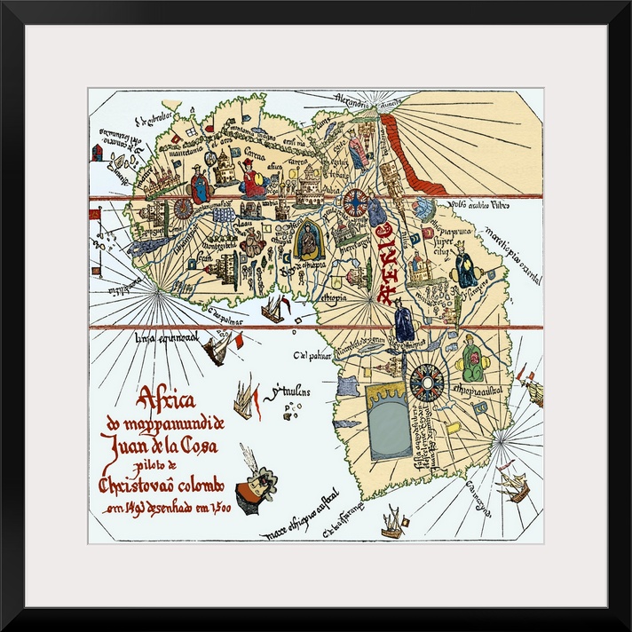 <p>Africa, from Juan de la Cosa's map of 1500. Juan de la Cosa (1460-1510) was a Spanish navigator and cartographer. In 1493 he joined Columbus on his second expedition to the New World. This map is a section of the world map produced by Cosa in 1500. The depiction of Africa owes much to the Portuguese explorer Vasco de Gama who, in 1497, found a trade route to India around the southernmost tip of Africa. Taken from A Book of Discovery (1912) by M.B. Synge.</p>