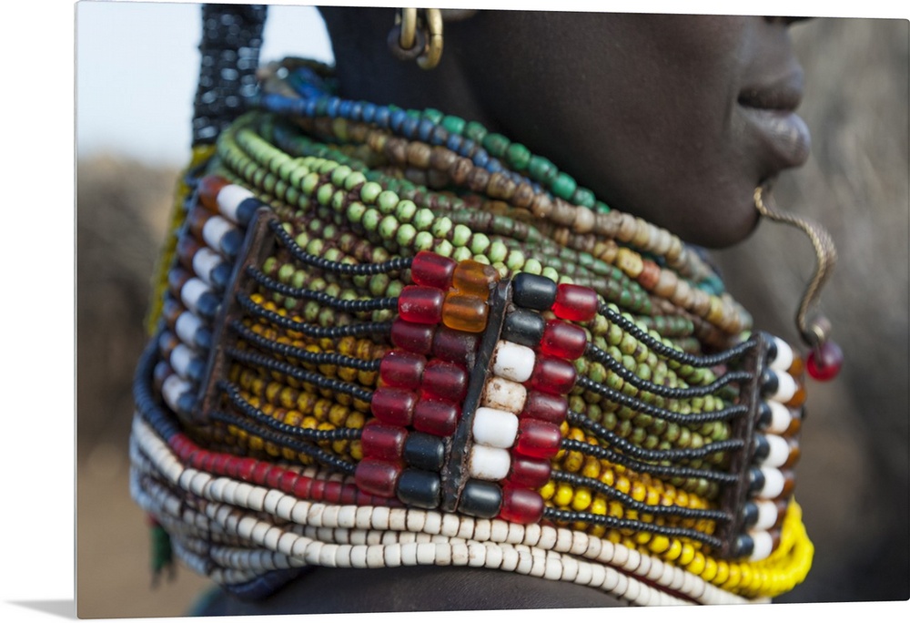 <p>Africa, Ethiopia, Southern Omo Valley, Nyangaton Tribe. Detail of a Nyangton woman's heavy bead necklace.</p>
