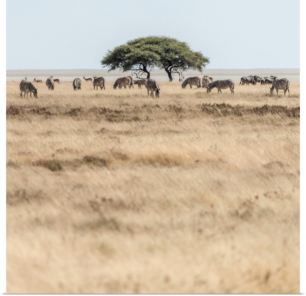 <p>Africa, Namibia, Etosha National park. Zebra herd with acacia tree in front of the Etosha pan.</p>