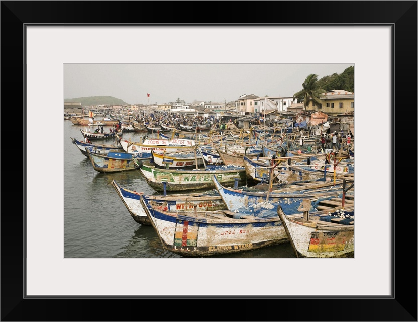 <p>Africa, West Africa, Ghana, Elmina. Colorful hand-painted fishing boats tied up at Elmina port.</p>
