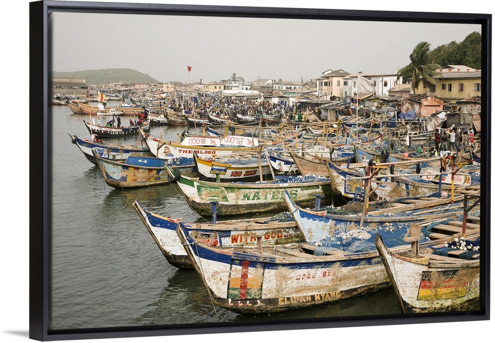 <p>Africa, West Africa, Ghana, Elmina. Colorful hand-painted fishing boats tied up at Elmina port.</p>